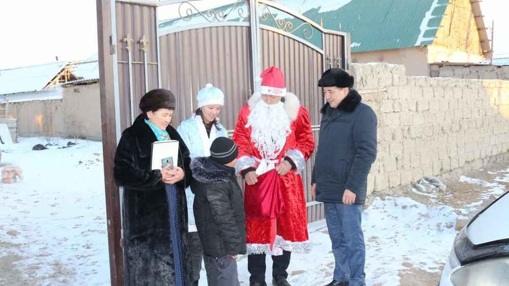Дед Мороз со Снегурочкой в Ат-Башы раздают детям подарки